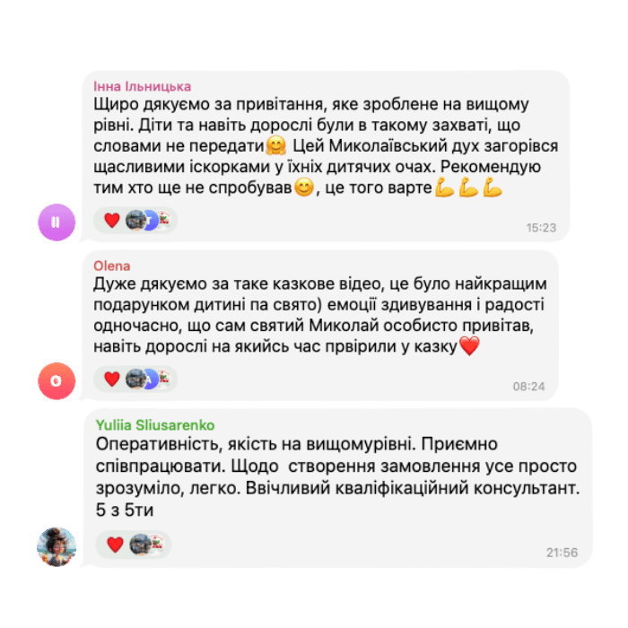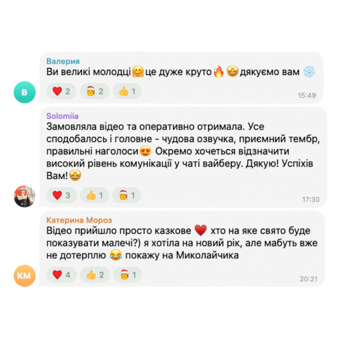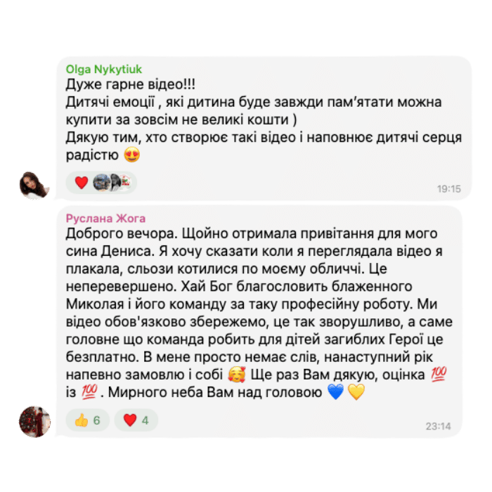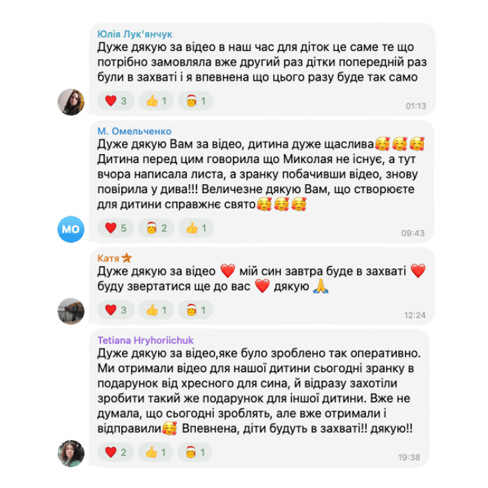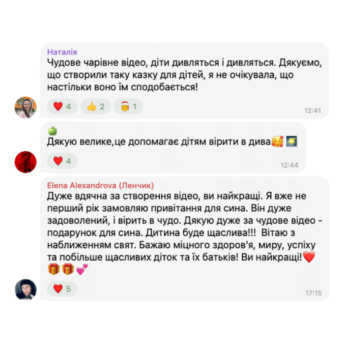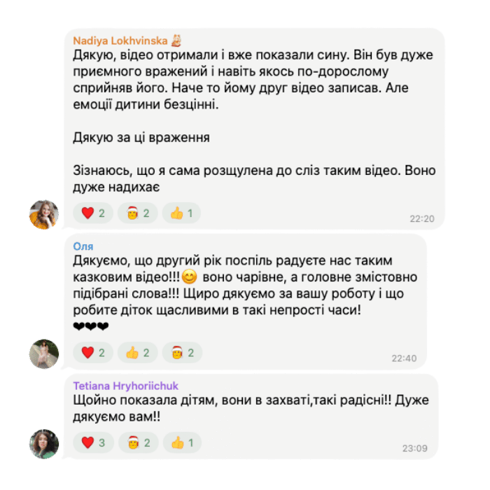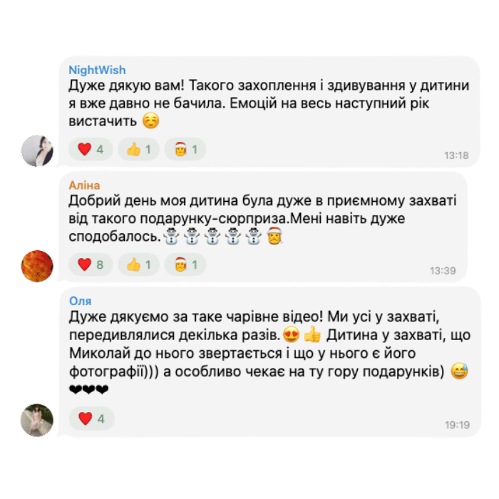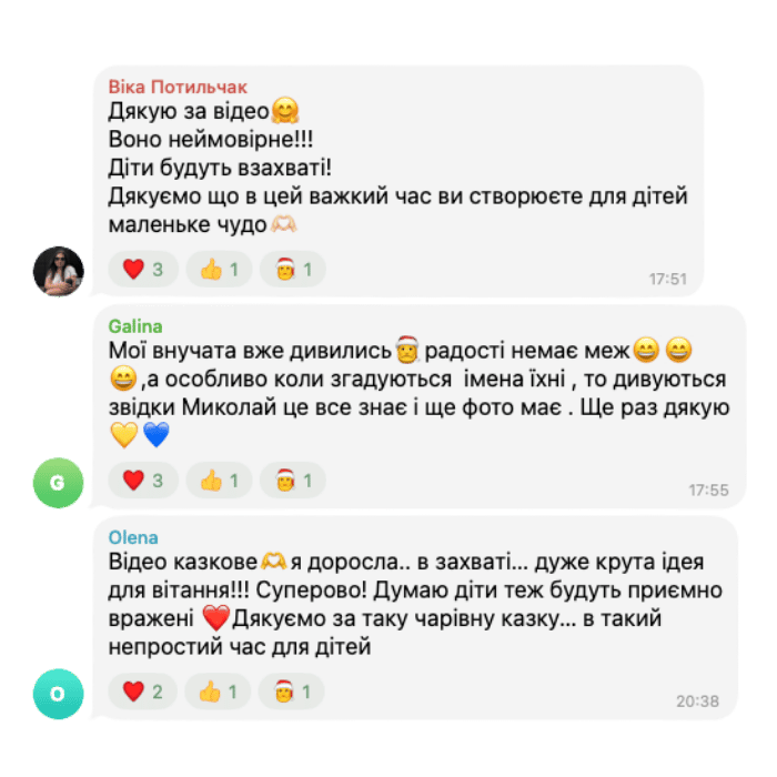Жодне відео не містить прямого згадування Санти або Миколая, тож ви можете презентувати відео дитині від того персонажу, якого прийнято у вашій родині.