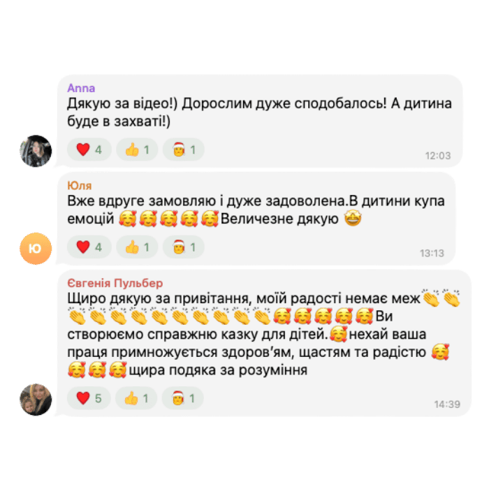 Замовлення, які були зроблені до 21:00, ми надсилаємо до кінця дня. Замовлення, які були зроблені після 21:00, ми надсилаємо наступного дня. Ми з особливою увагою підходимо до цієї роботи — адже це подарунок для дітей, а він повинен бути ідеальним.